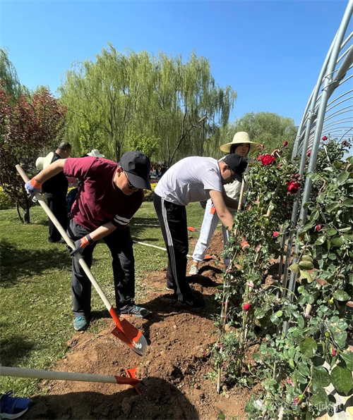 活动当日晴空万里,在公园专业技术人员指导下,集团领导率先垂范,与干部职工“并肩奋战”,大家分工明确、协作有序,共同栽种海棠、榆叶梅、碧桃等观赏树木和牡丹、月季、绣球等花卉,为黄河之畔再添新绿。泥土芬芳中,铁锹与笑语和鸣成曲,青年团员们自发组成“搬运苗木小分队”穿梭奔忙保障供给;部分女职工组成“杀菌沃土先锋组”,精准投放药剂为土壤消毒;由青年党员组成的“乔木攻坚团” 更是勇挑重担,主动承担种植冠幅大、重量重的海棠、碧桃等乔木的任务,喊着口号扶正碗口粗的树干,覆土时反复校准树干垂直度,各小组默契配合,现场一片热火朝天。随着“种植先锋队”完成最后一株月季栽种,历时三小时的连续奋战,295株新苗在公园内指定规划区域内安家落户,形成“春观海棠、夏赏绣球、丁香独秀、月季连廊”丰富的景观带。