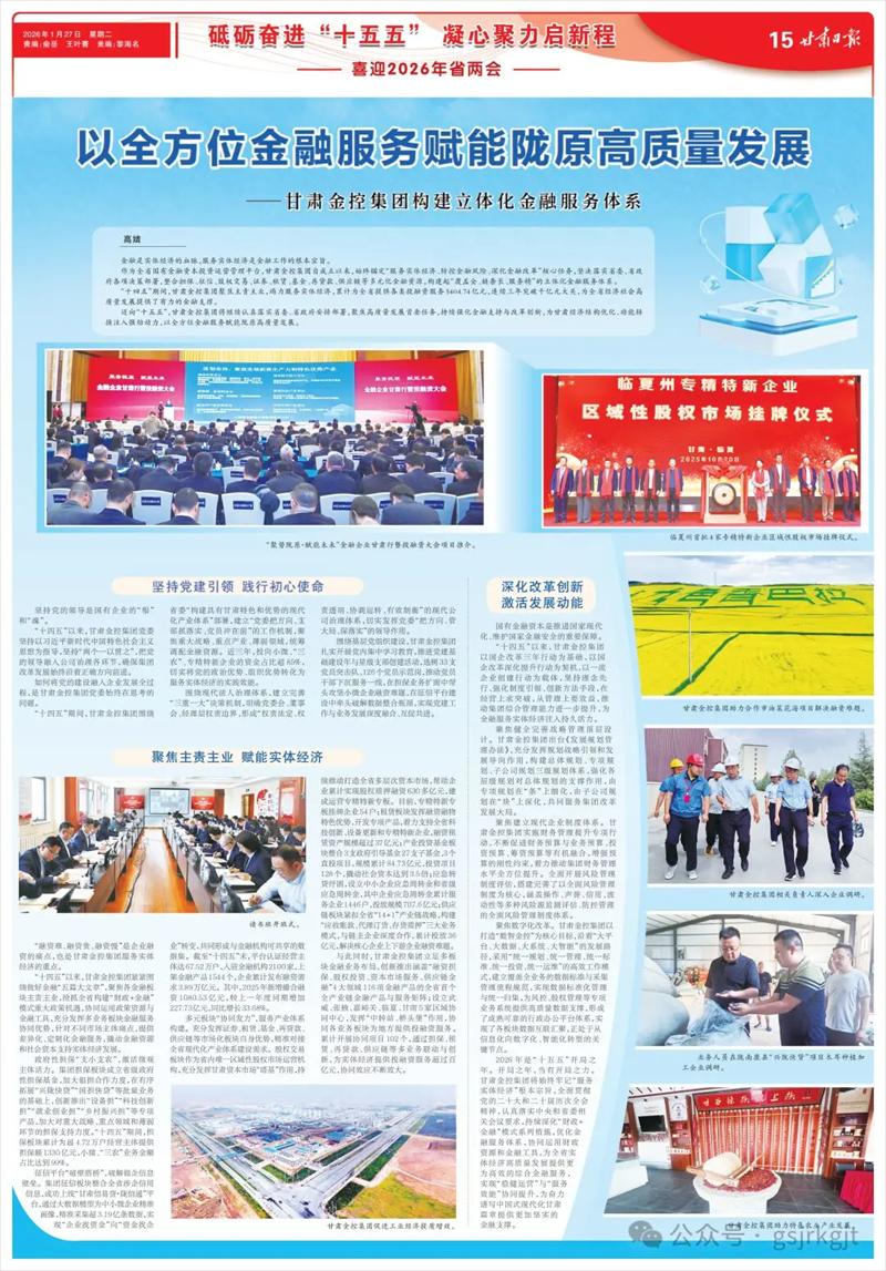 2026年是“十五五”开局之年。开局之年,当有开局之力。半岛体育将始终牢记“服务实体经济”根本宗旨,全面贯彻党的二十大和二十届历次全会精神,认真落实中央和省委相关会议要求,持续深化“财政+金融”模式系列措施,优化金融服务体系,协同运用财政资源和金融工具,为全省实体经济高质量发展提供更为高效的综合金融服务,实现“稳健运营”与“服务效能”协同提升,为奋力谱写中国式现代化甘肃篇章提供更加坚实的金融支撑。(高婧)
